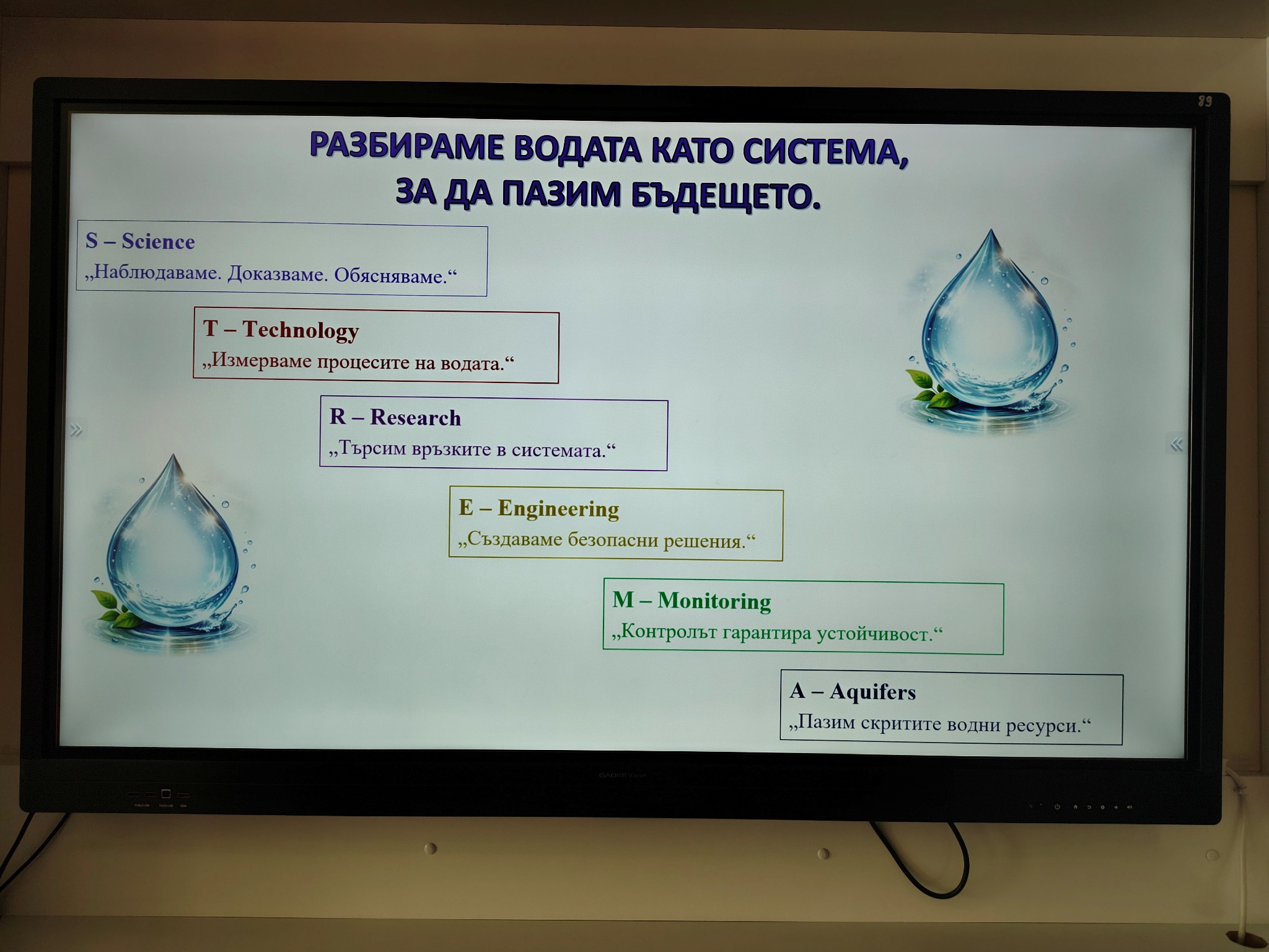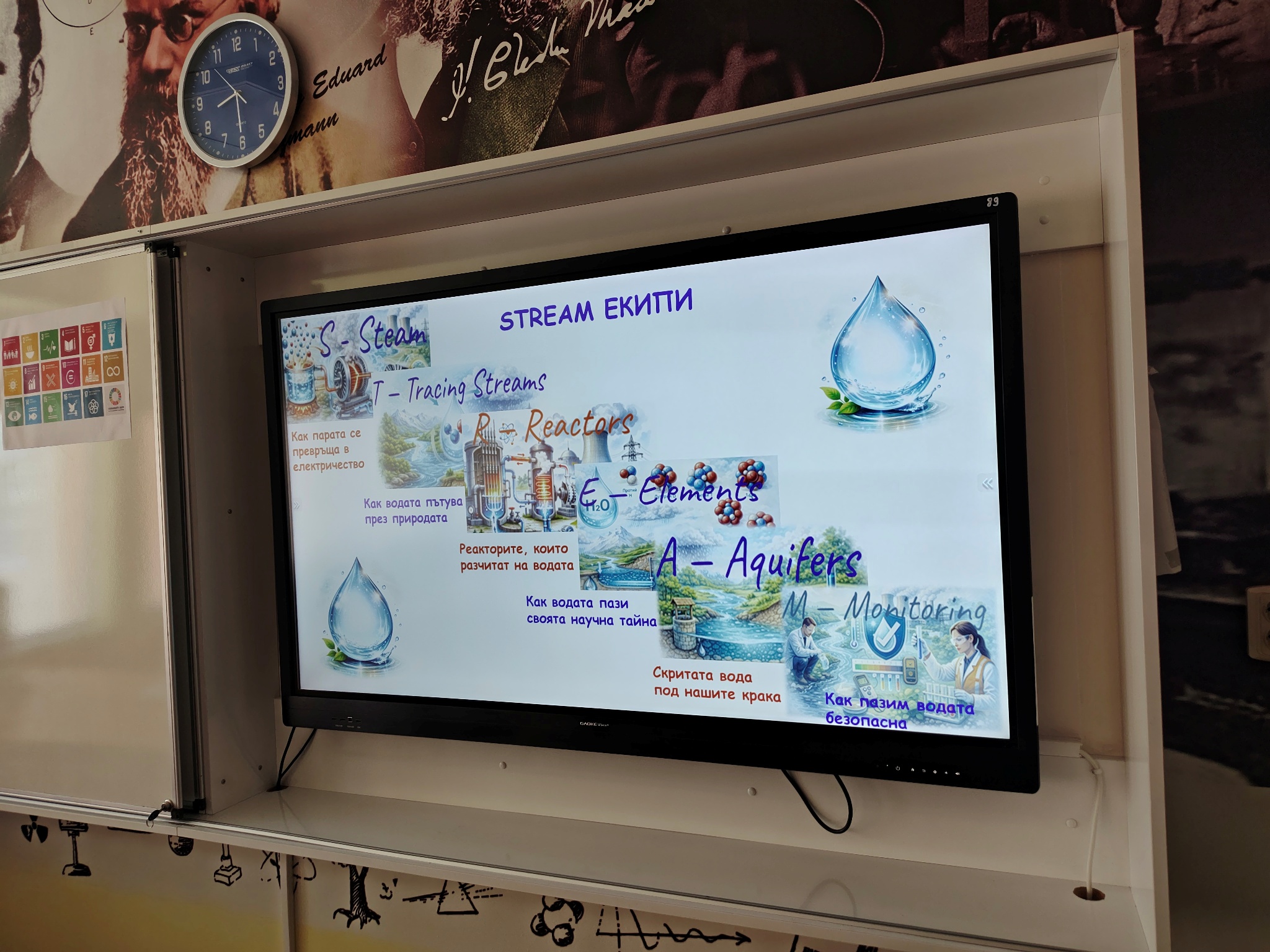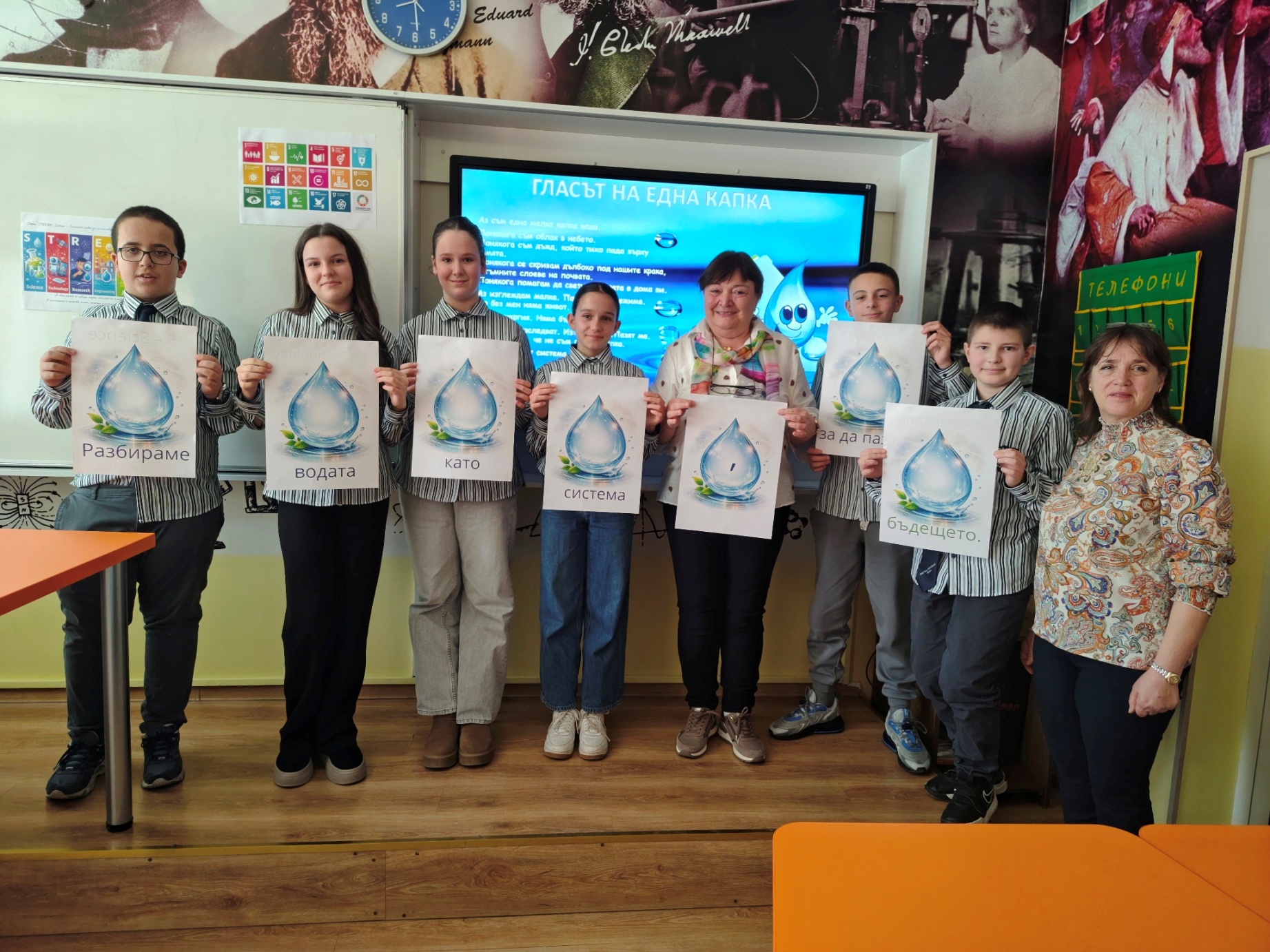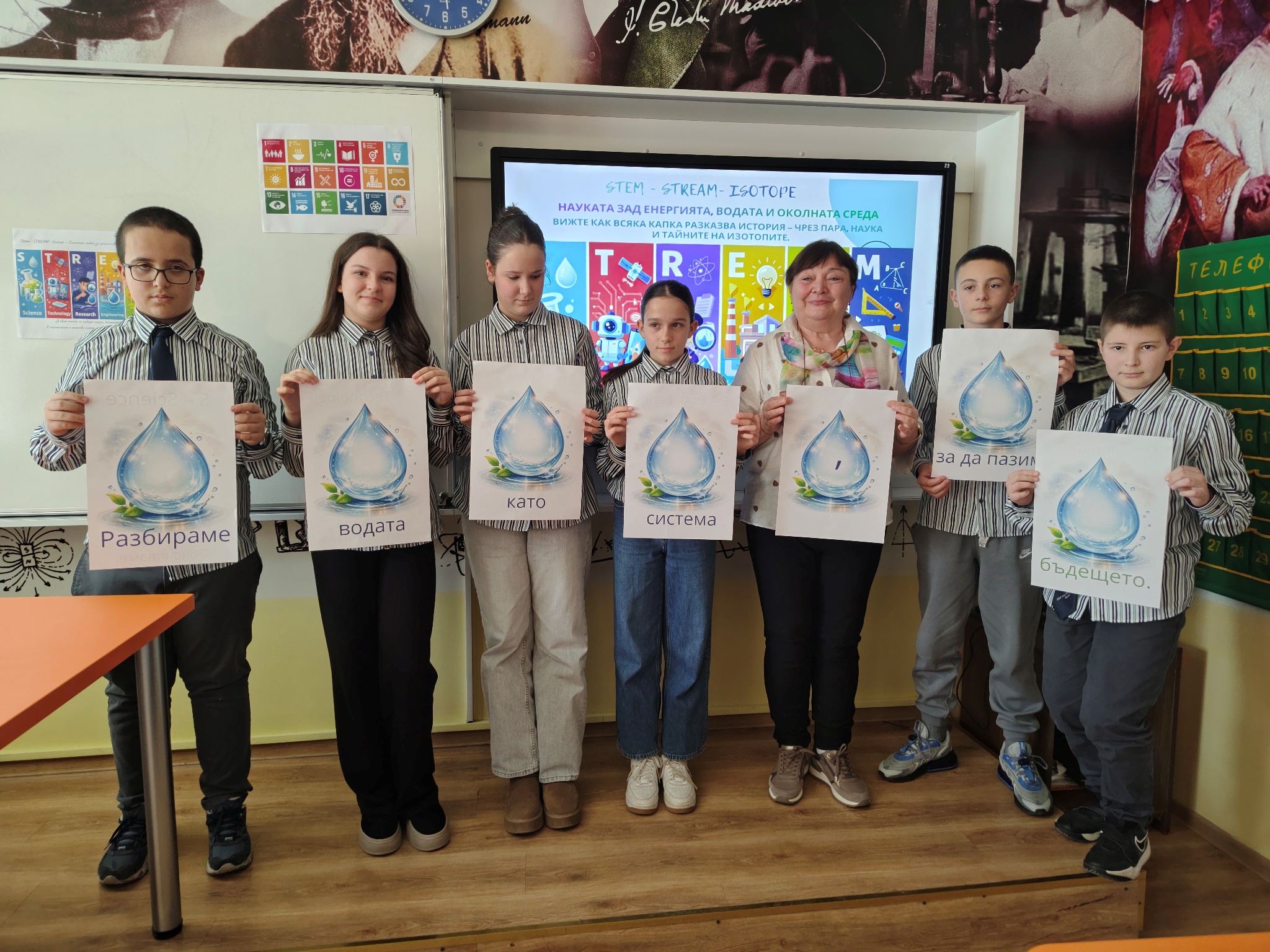 Чрез интегрален STREAM подход учениците проследиха пътя на една капка вода и изследваха връзките между природните процеси, производството на енергия и съвременните научни методи за опазване на водните ресурси и целите за устойчиво развитие на ООН. Шестокласниците работиха в екипи, анализираха научна информация и обсъждаха значението на водата като природен ресурс. Чрез различни роли учениците разгледаха темата от гледна точка на науката, технологиите, изследванията и инженерните решения, а в края на занятието представиха своите изводи и предложения. Работата в екип и публичното представяне на резултатите им позволиха да развият умения за аргументация, сътрудничество и критично мислене.